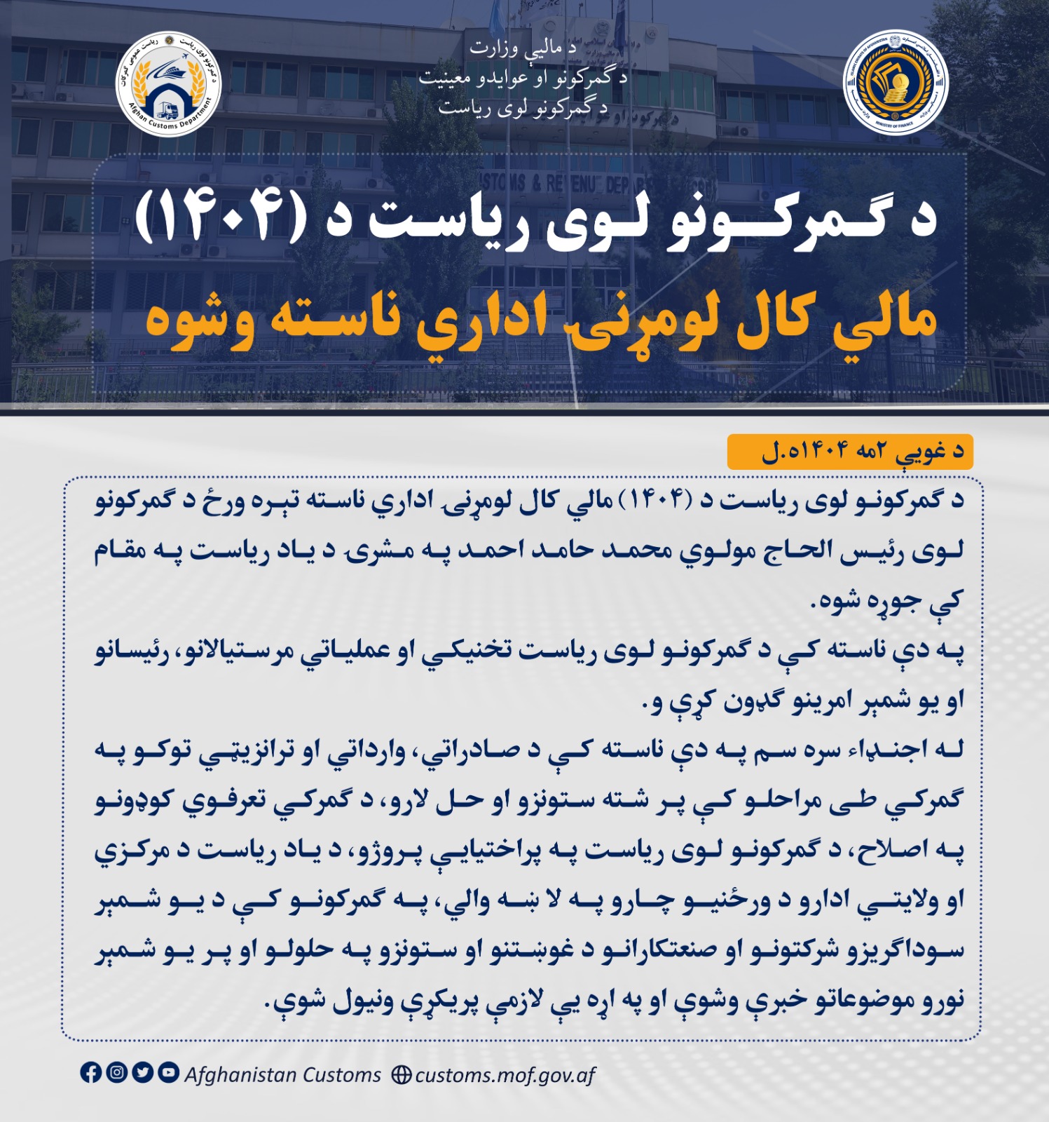 د ګمرکونو لوی ریاست په دې هڅه کې ده، چې په هیواد کې د سوداګرۍ د لا ودې لپاره په ګمرکونو کې سوداګرو ته ټولې لازمې اسانتیاوې برابرې کړي او تاسې ته ډاډ درکوي، چې هره افغانۍ ګمرکي محصول، چې له سوداګریزو توکو څخه اخیستل کیږي، په پوره روڼتیا سره بیت المال ته تحویلیږي.