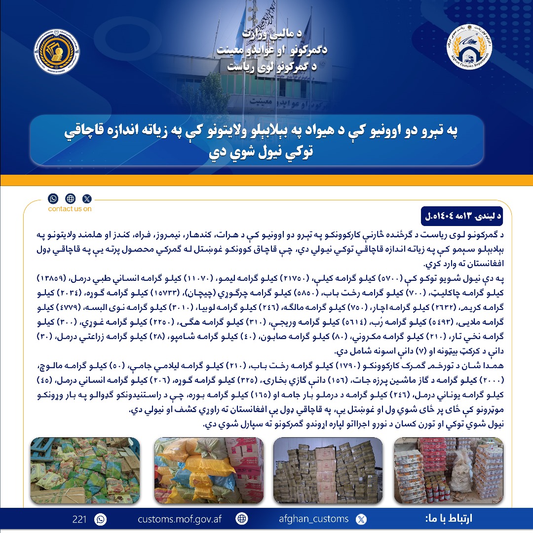 په تېرو دو اوونیو کې د هیواد په بېلابېلو ولایتونو کې په زیاته اندازه قاچاقي توکي نیول شوي دي! 13 قوس 1404 په تېرو دو اوونیو کې د هیواد په بېلابېلو ولایتونو کې په زیاته اندازه قاچاقي توکي نیول شوي دي!