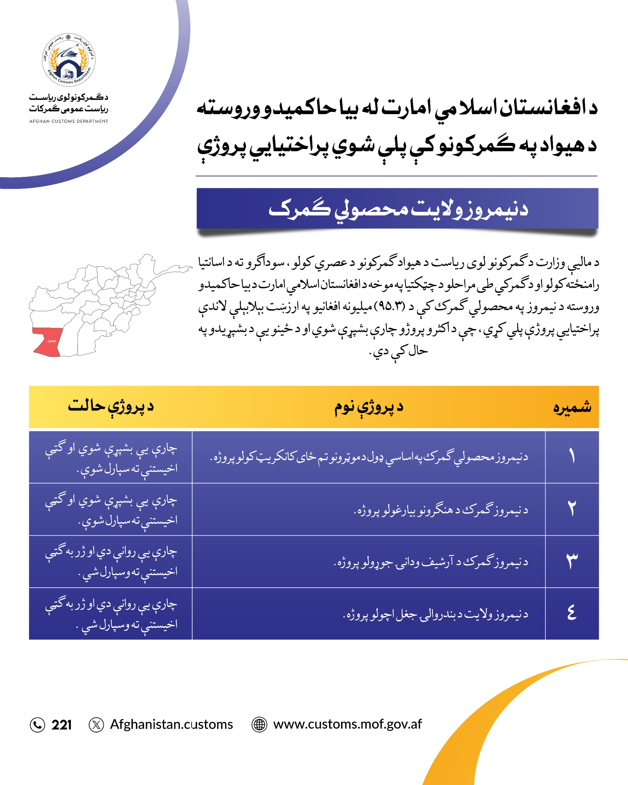 افغانستان اسلامي امارت له بیا حاکمیدو ورورسته د نیمروز ولایت په محصولي ګمرک کې د (۹۵.۳) میلیونه افغانیو په ارزښت پلي شوې پراختیایي پروژې 11 April 2026 افغانستان اسلامي امارت له بیا حاکمیدو ورورسته د نیمروز ولایت په محصولي ګمرک کې د (۹۵.۳) میلیونه افغانیو په ارزښت پلي شوې پراختیایي پروژې